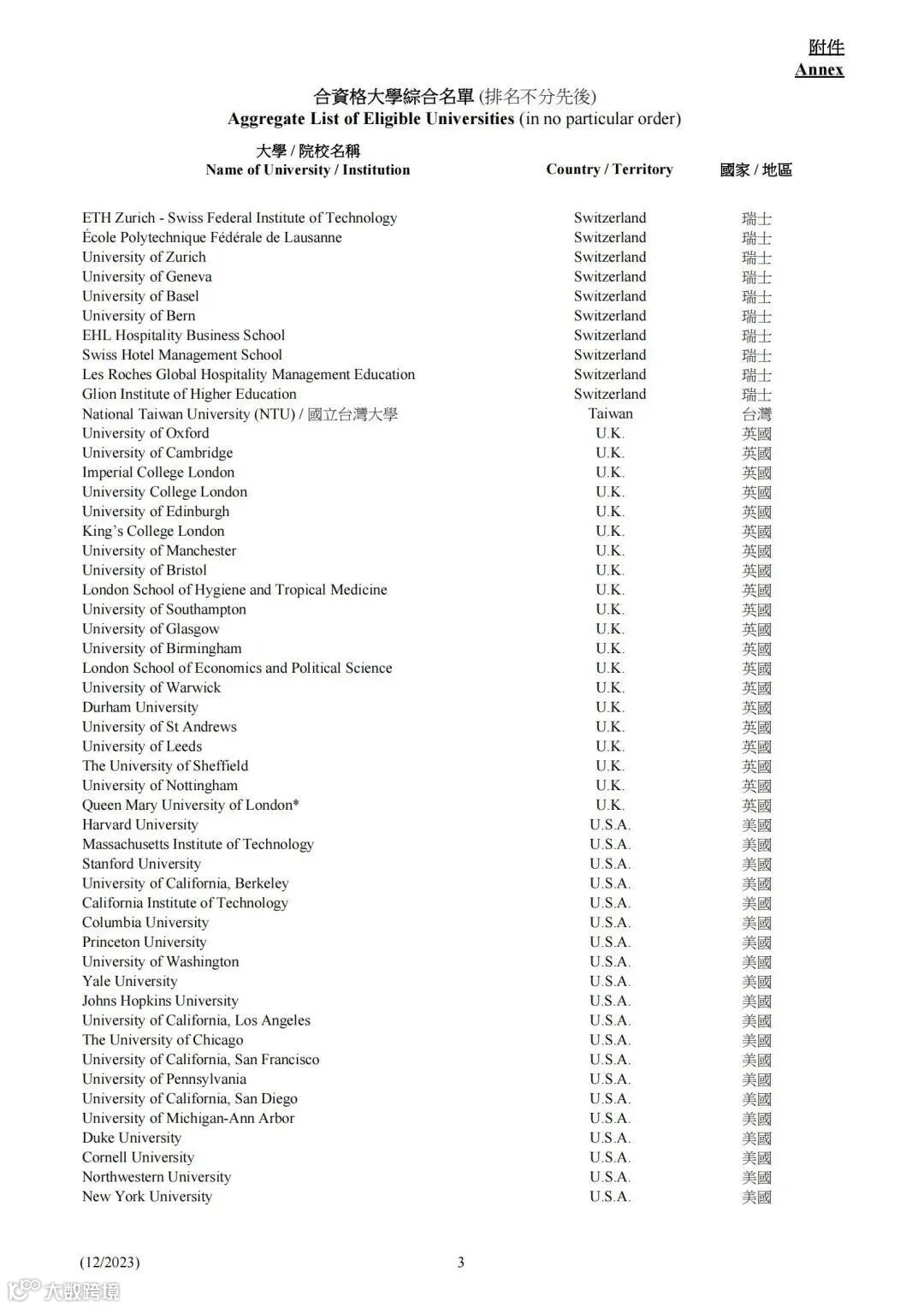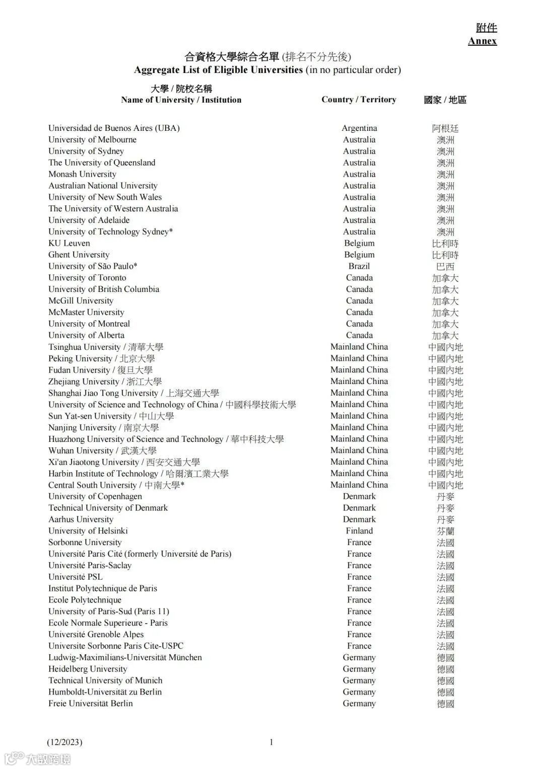 好消息,继10月底香港施政报告发布之后,短短两月,港府再次更新《合资格大学综合名单》,新增4所,删除3所!更新后的名单涵盖185间合资格大学及院校,榜单于2024年1月1日生效!