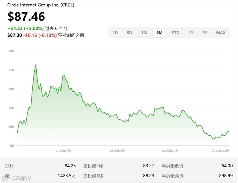 Circle 于 2025 年 6 月 5 日 在纽交所挂牌上市。上市初期风光无限,股价最高突破 250 美元,备受资本追捧。然而好景不长,随后股价一路回落,短短半年就跌去了三分之二。