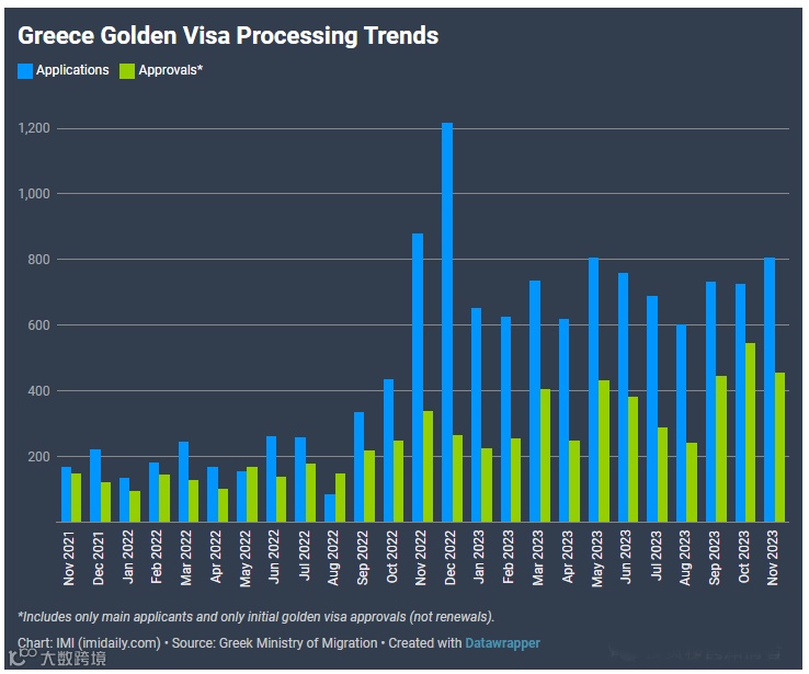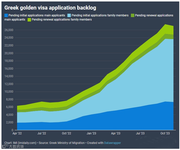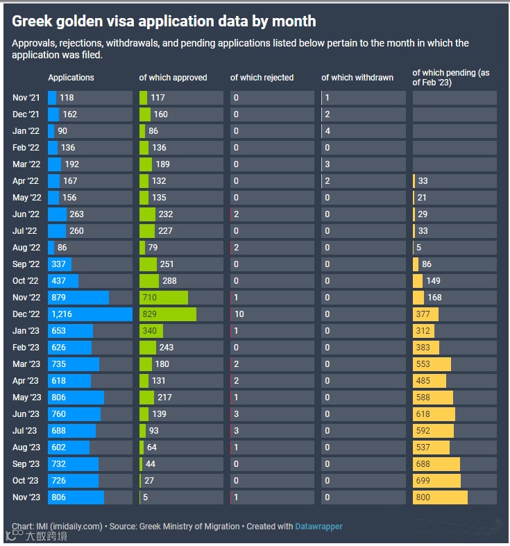 截至今年11月底,希腊已经收到7,752宗申请案,创下历史新高,比2022年全年多出78%。值得注意的是,今年还有1个月的时间,这使得该项目成为2023年全球黄金签证申请量最大的项目。