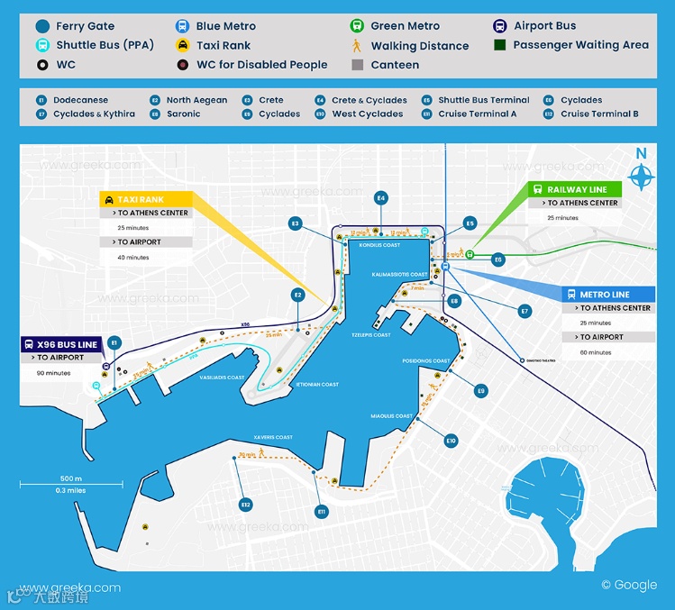 比港每个区域都有多个公交站,比港地铁1号线直达雅典中部,北部和南部,2022 年雅典比雷埃夫斯地区共有三个新地铁站已向公众开放。除了三个新车站使线路上的车站总数增加到 27 个之外,还有 7.6 公里的隧道和相关基础设施。