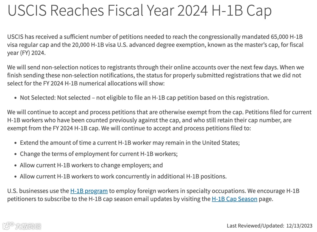 近日,美国移民局宣布:今年(2024财年)3月起启动申请的H-1B的申请名额已达85,000份上限!也就意味着本年度的H1B不再会进行第三轮抽签。