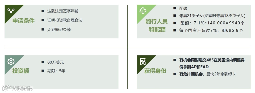 1、投资金额要求:在TEA地区投资80万美元,或非TEA地区投资105万美元;