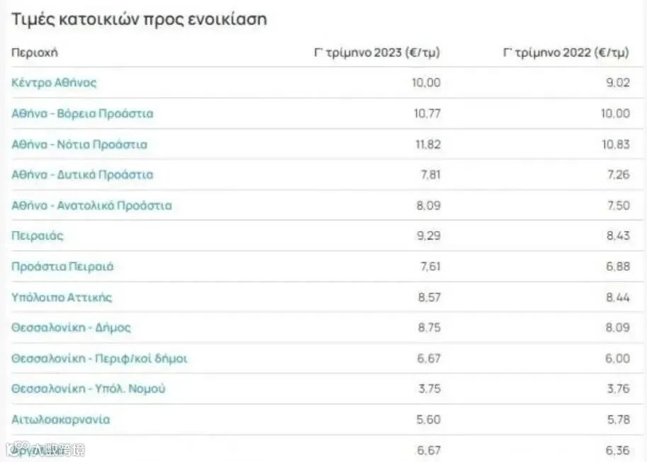 住宅租赁方面:今年第三季度希腊房屋整体租金价格也普遍上涨,其中雅典市中心涨幅最大,达到10.9%,平均每平方米租金价格从2022年第三季度的9.02欧元首次攀升至每平方米10欧元。