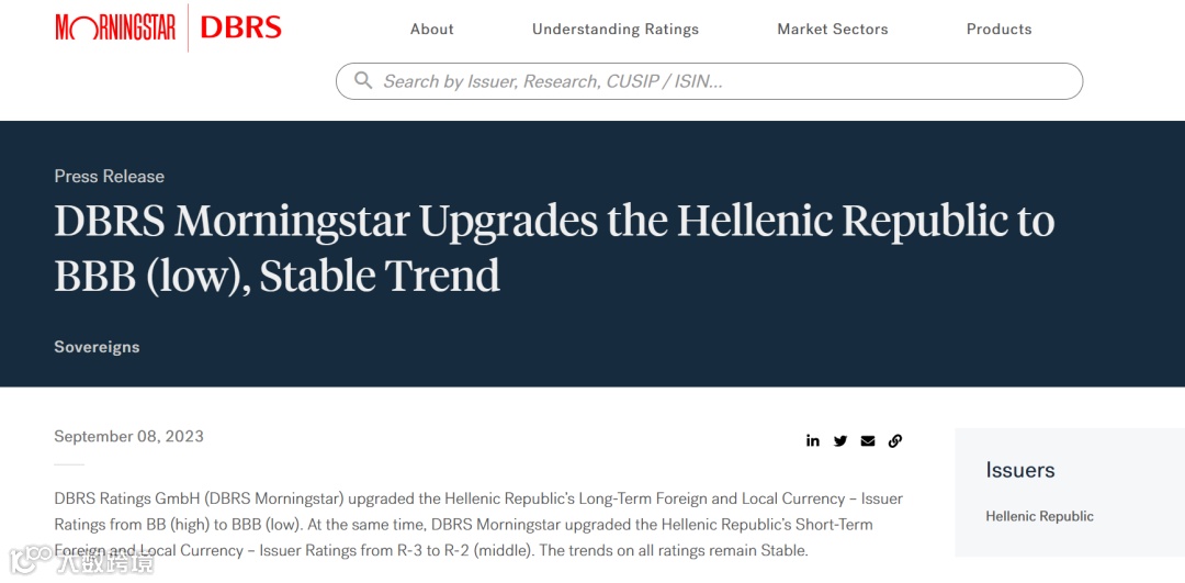 晨星DBRS是全球四大评级机构之一,DBRS在公告中称,此次评级上调与希腊的经济指标相符,并指出希腊政府将继续履行财政责任,确保公共债务比率稳步下降。