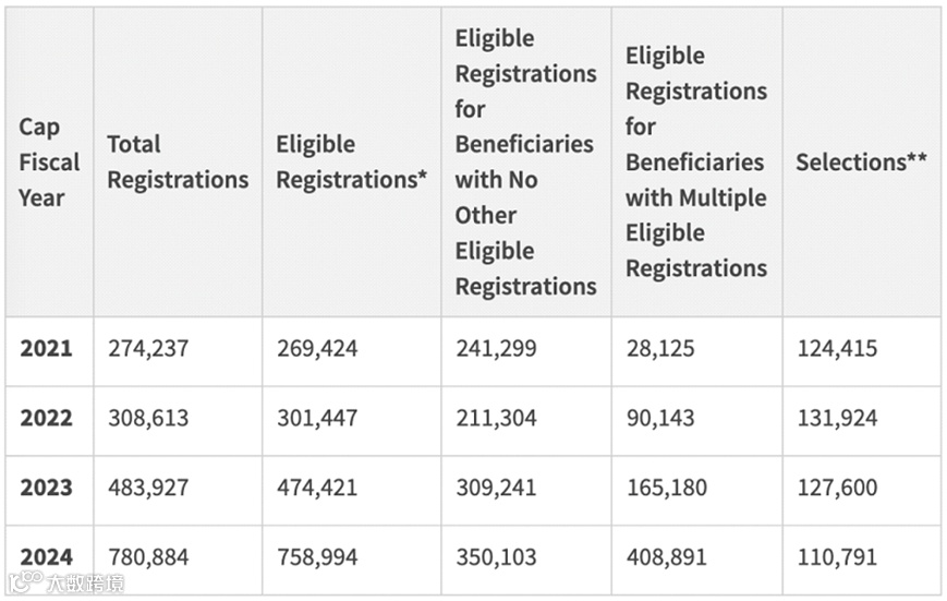 H-1B工作签证是申请工签合法留在美国的主要途径,国际留学生想要留在美国工作,基本都是通过这个途径,H-1B签证每年只有8.5万个名额。而今年共有780,884份H-1B网上注册,有效注册为758,994份,有效中签率为14.6%,去年为26.9%,骤减了一半,创造了自从有H-1B抽签程序以来的史低纪录。从以下图表可以看出,每年的注册人数都还在不断上升。