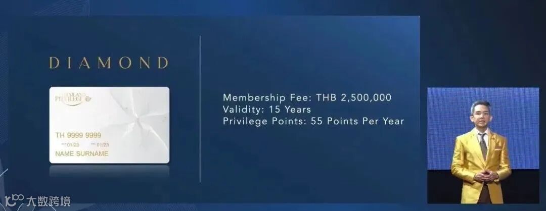 DIAMOND:钻石卡:费用为250万泰铢,会员年限为15年。居泰期间每年可获得55点积分,积分可兑换额外的特权服务。