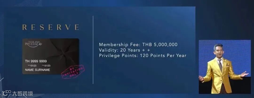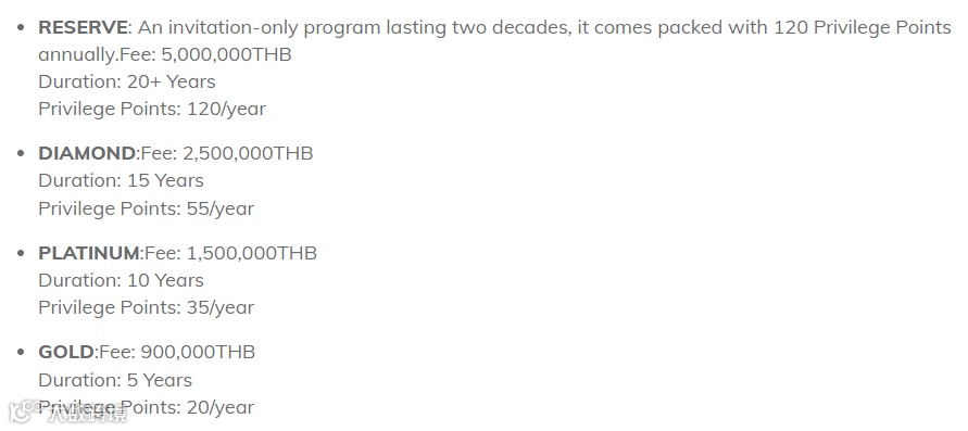 RESERVE:黑金至尊卡:费用为500万泰铢,会员年限为20年+。每5年续签一次,可长期出入泰国。每年累计120点积分,可用于兑换住宿、旅行、便利、投资、医疗保健等超值服务。该会员仅限于被邀请者,每年新增会员人数不超过100人。