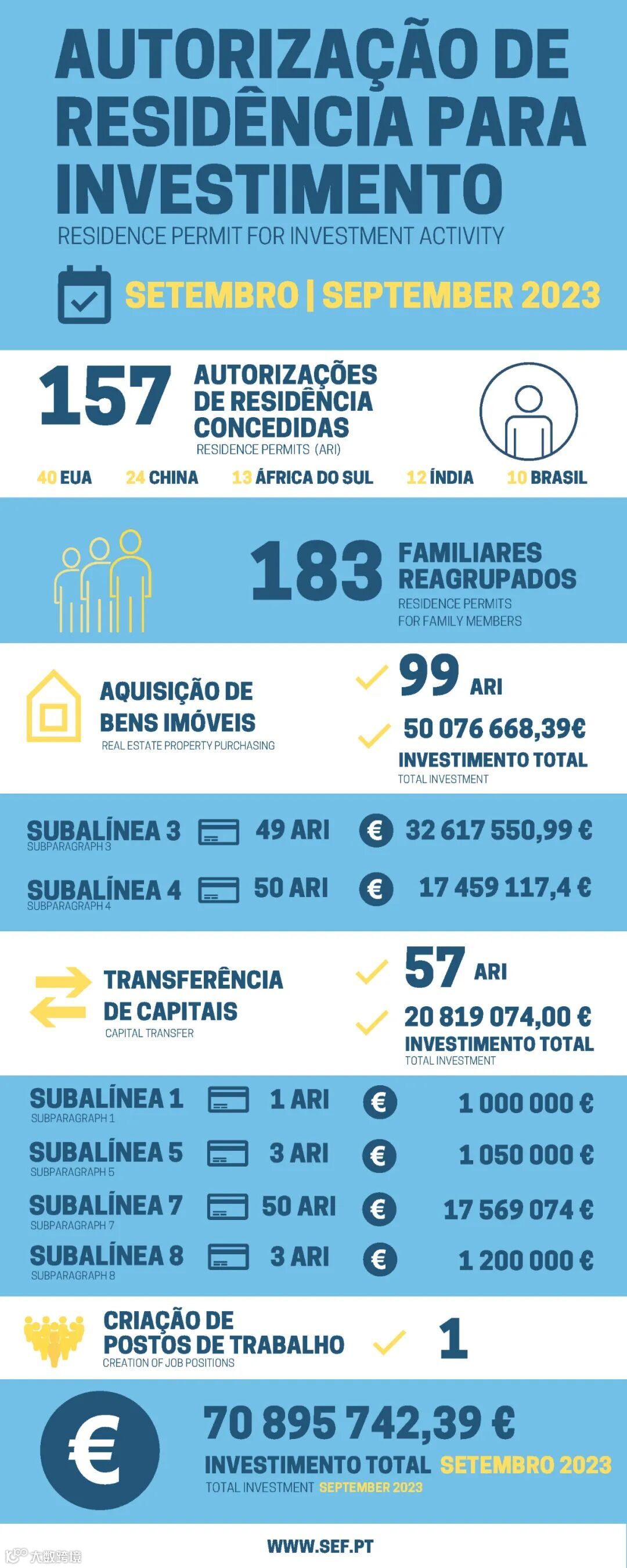 近日,葡萄牙移民局(SEF)公布了2023年9月黄金签证数据。9月份的葡萄牙投资移民黄金卡审批批准数量为157份。虽然葡萄牙购房移民已经关停,但投资移民审批还在继续。