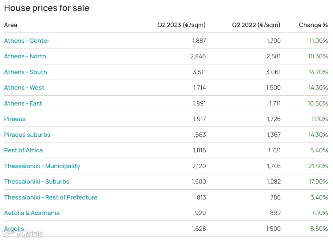 结合希腊最大的房产交易信息网站Spitogatos发布的房产均价数据,2023年第二季度:
