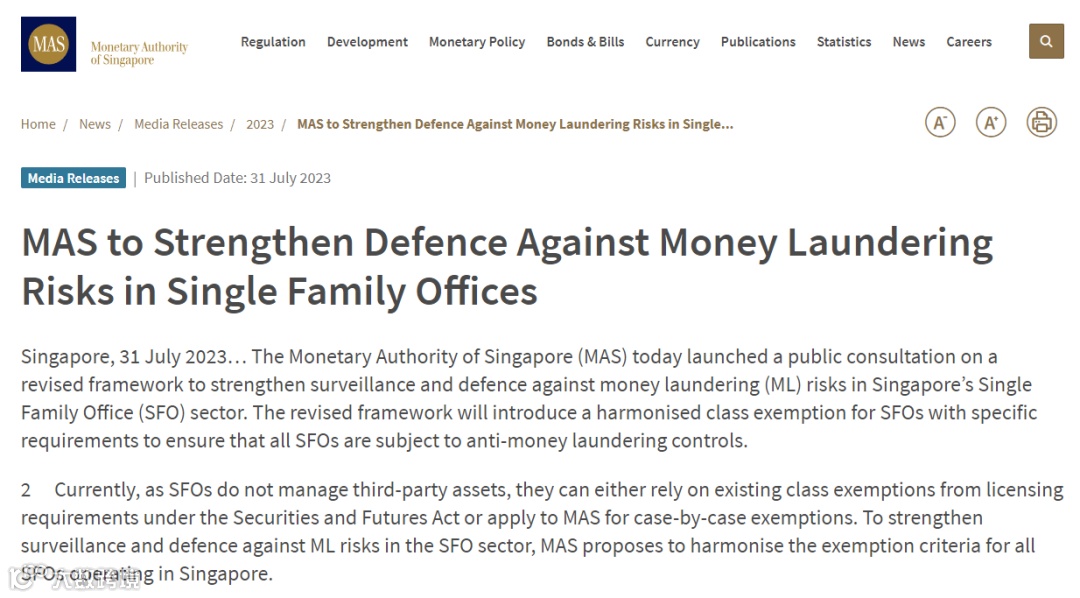 此外,为加强监督和防范单一家族理财办公室的洗钱风险,新加坡金融管理局有意修改框架,引入统一的许可豁免条件以及特定要求,以确保所有单一家办都受到反洗钱监控。