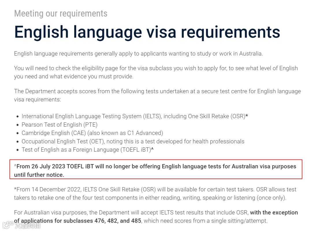澳大利亚移民局官网更新,自2023年7月26号, TOEFL iBT(托福)将不再提供用于澳洲签证申请的英语语言成绩,直到后续通知。