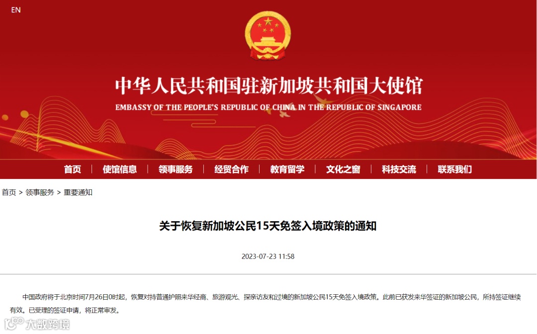 中国驻新加坡大使馆网站发布“关于恢复新加坡公民15天免签入境政策的通知”,中国即将在7月26日开始恢复对新加坡免签!持新加坡普通护照来华经商、旅游观光、探亲访友和过境的新加坡公民,将享有15天免签入境政策。