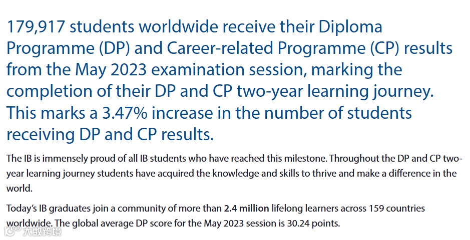 2023年IB考试结果:全球均分30.24,及格率为79.35%。共有179名满分学生,全球IBDP单科平均成绩为4.84,每门科目成绩最高为7。