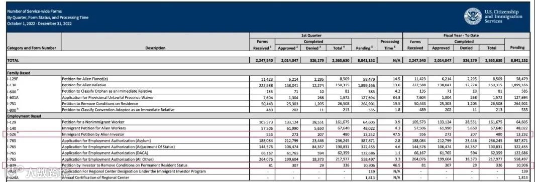 近日,美国移民局公布了2023财年第一季度(2022年10-12月)的数据—共计556份I-526申请(包括I-526E)。