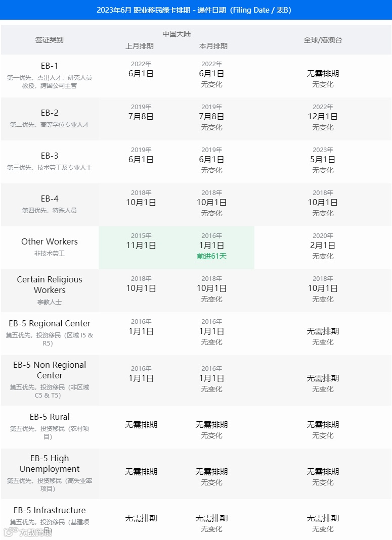 美国:6月移民签证排期表公布