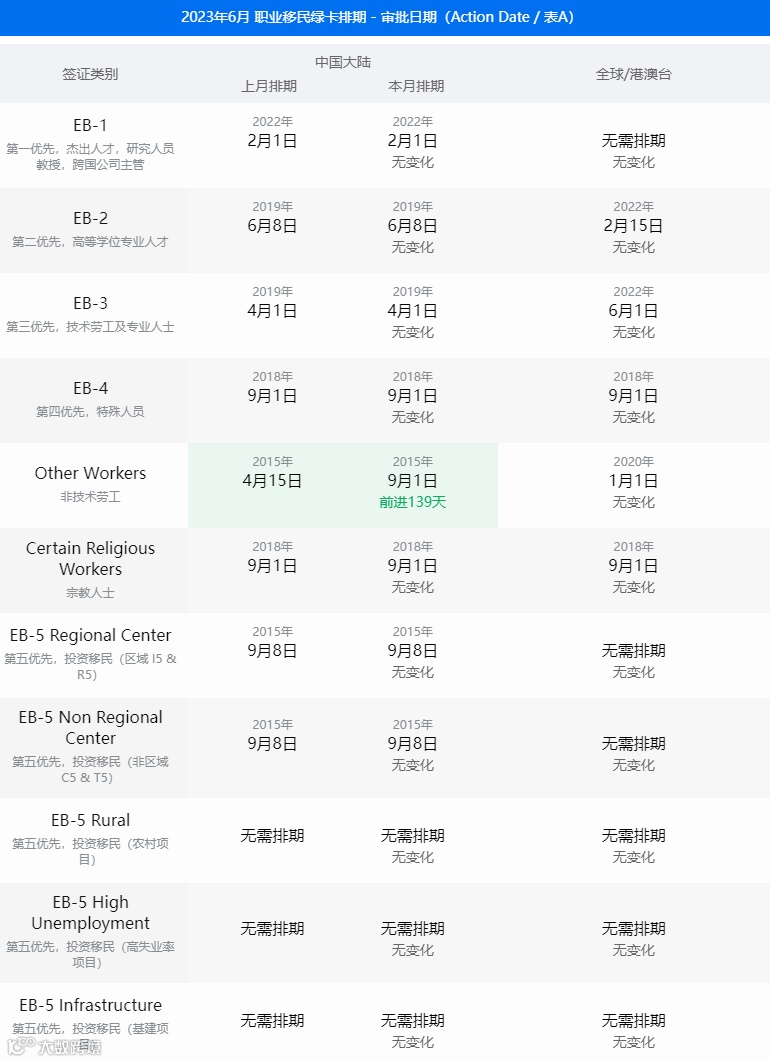 美国国务院签证办公室公布了2023年6月的签证公告(Visa Bulletin),关于职业移民和亲属移民排期表详情见以下表格。