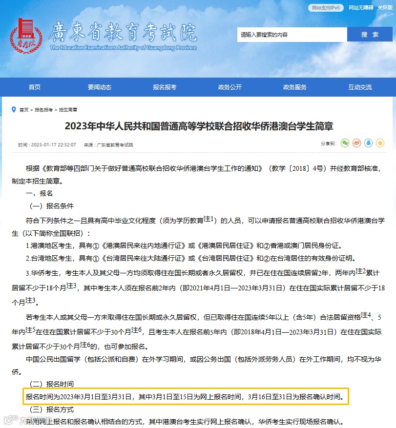 2023年1月17日,广东省教育考试院正式公布《2023年中华人民共和国普通高等学校联合招收华侨港澳台学生简章》。