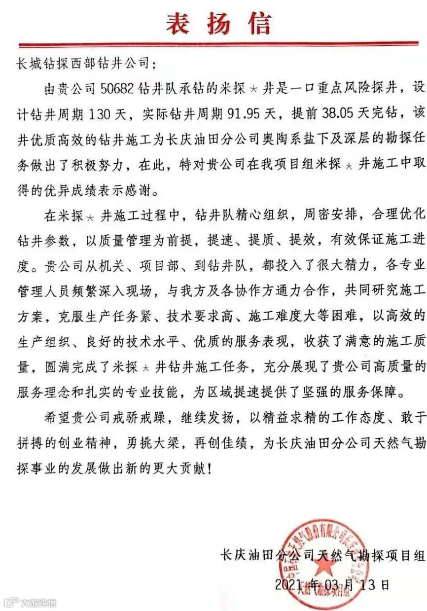 甲方在表扬信中说:由西部钻井公司50682队承钻的米探*井是集团公司重点风险探井。该井设计钻井周期130天,50682队较设计提前38.05天完钻,以优质高效的钻井施工,为长庆油田奥陶系及深层勘探做出了积极努力。