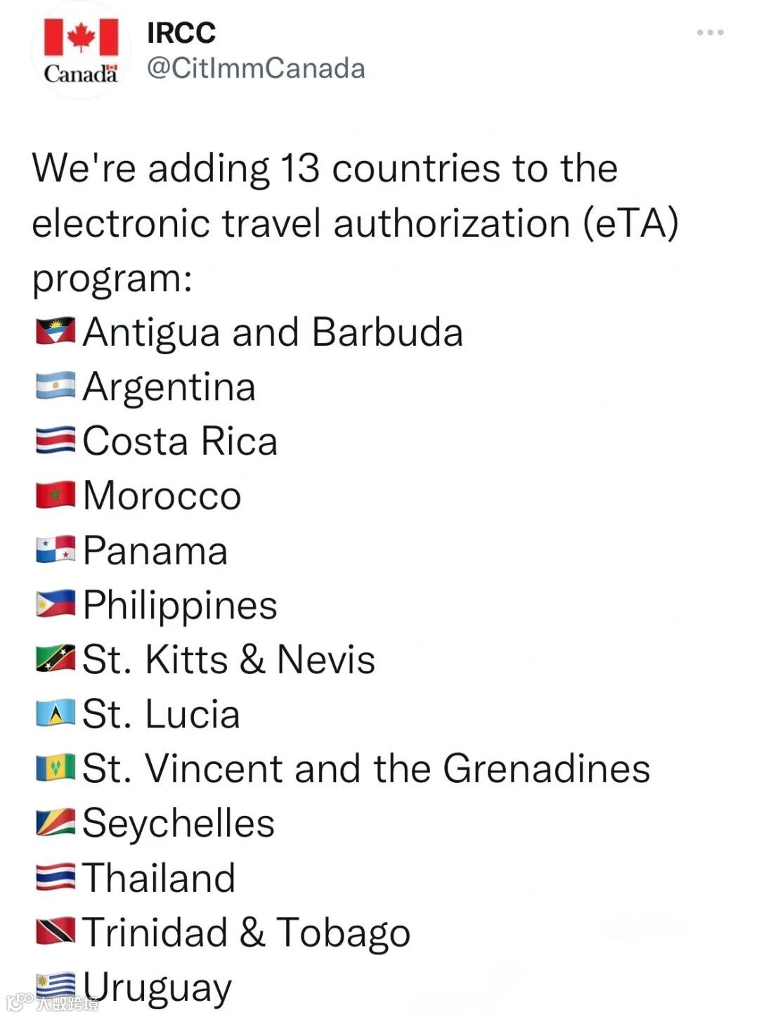 加拿大移民、难民和公民部部长肖恩·弗雷泽宣布:将以上13个国家加入电子旅行授权(eTA)计划。eTA是一种电子旅行证件,申请人需要满足以下条件:过去10年持有加拿大签证或目前持有有效的美国非移民签证。
