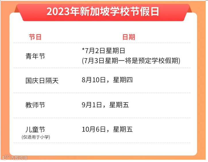 2023年新加坡学校假期包括青年节第二天的星期一(7月3日)、国庆日第二天(8月10日)、教师节(9月1日)以及儿童节(10月6日)。