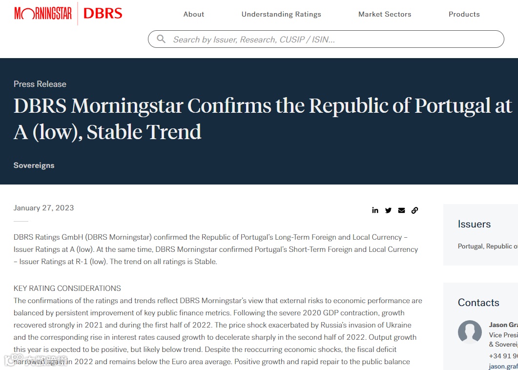 1月27日,国际金融评级机构DBRS确认葡萄牙主权债务评级为“A”(低),前景稳定。