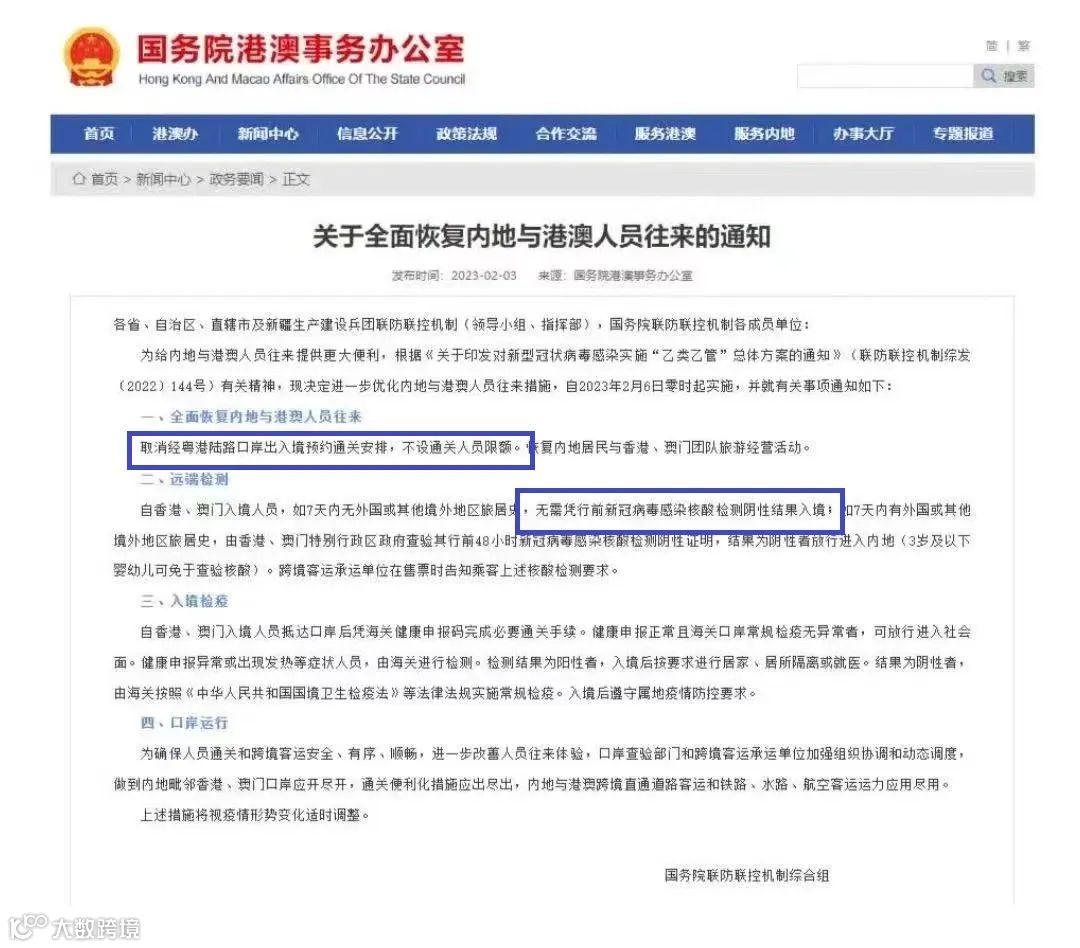 据国务院港澳事务办公室:2月6日零时起,全面恢复内地与港澳人员往来。取消经粤港陆路口岸出入境预约通关安排,不设通关人员限额。恢复内地居民与香港、澳门团队旅游经营活动。