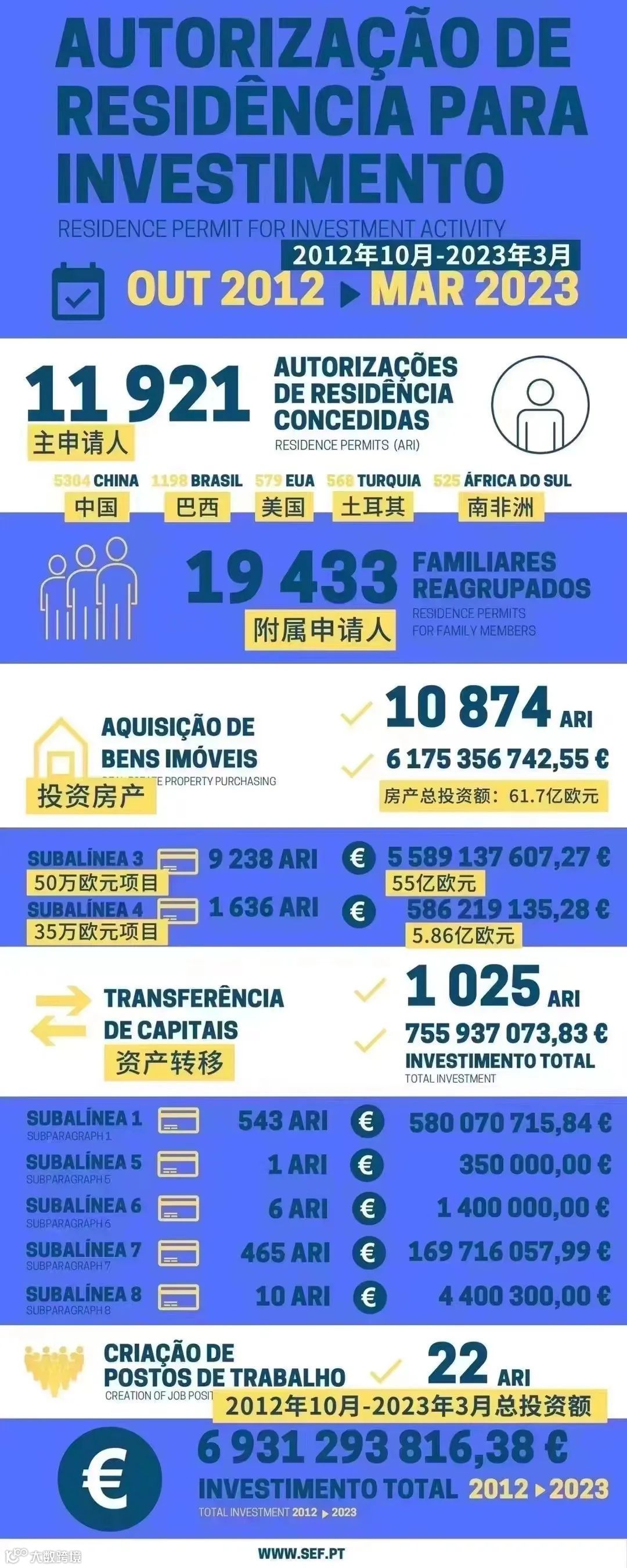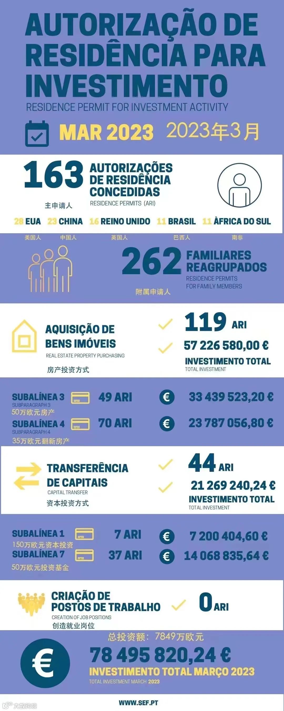 近日,葡萄牙移民局(SEF)公布了新的黄金签证数据:2023年3月共有163位主申请人和262位附属申请人获批葡萄牙黄金签证。其中,来自中国的主申请人为23人,在申请人国家中排在第二。美国再次拿回第一共有28人,其次是英国16人、巴西11人、南非11人。