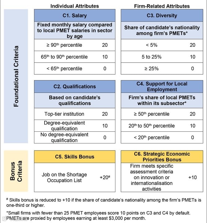 新的COMPASS评估,要求申请者需在四个基本项目包括月薪、学历、企业员工多元化及支持聘用新加坡人的评估中,取得至少40分,才能申请或更新准证。