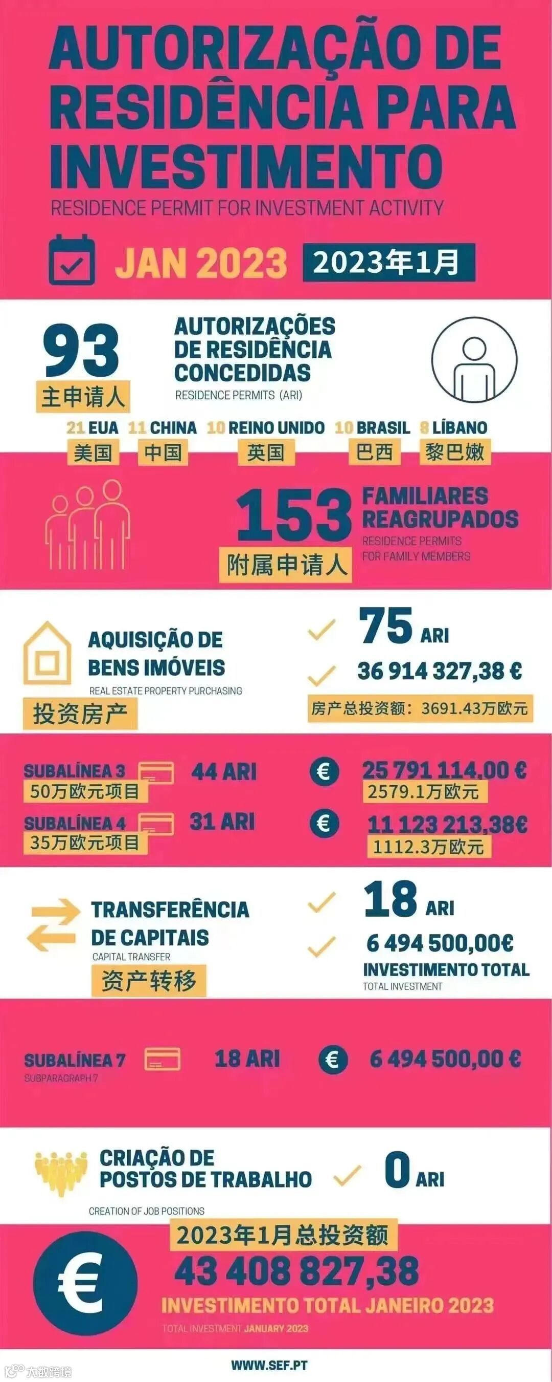 近日,葡萄牙移民局(SEF)正式发布了葡萄牙黄金签证的1月最新统计数据。