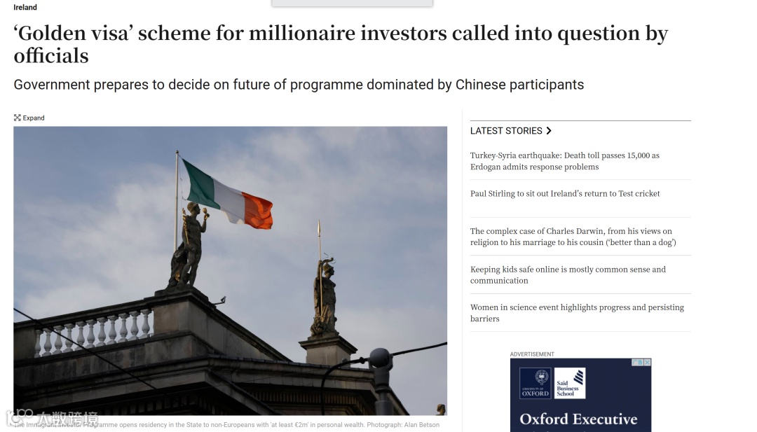 爱尔兰司法部官员对面向投资移民的“黄金签证”计划提出了质疑:近年申请加入投资移民项目的中国公民人数占比激增,引发爱尔兰政府担忧。