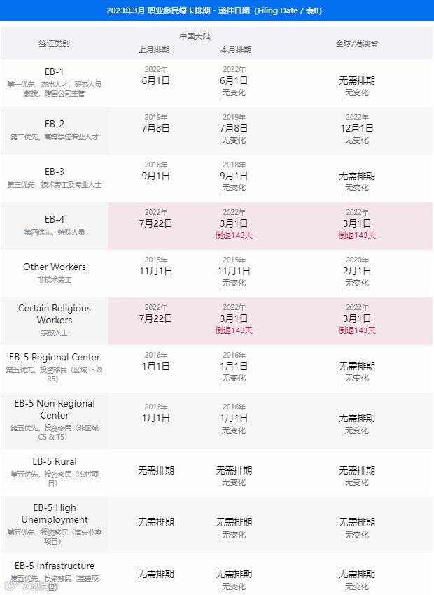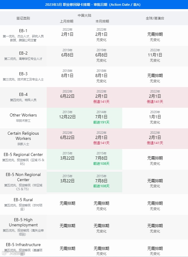 美国国务院签证办公室公布了2023年3月的签证公告(Visa Bulletin),关于职业移民和亲属移民排期表详情见以下表格。
