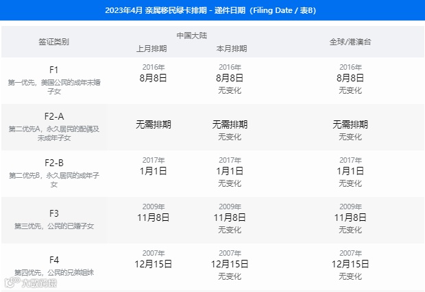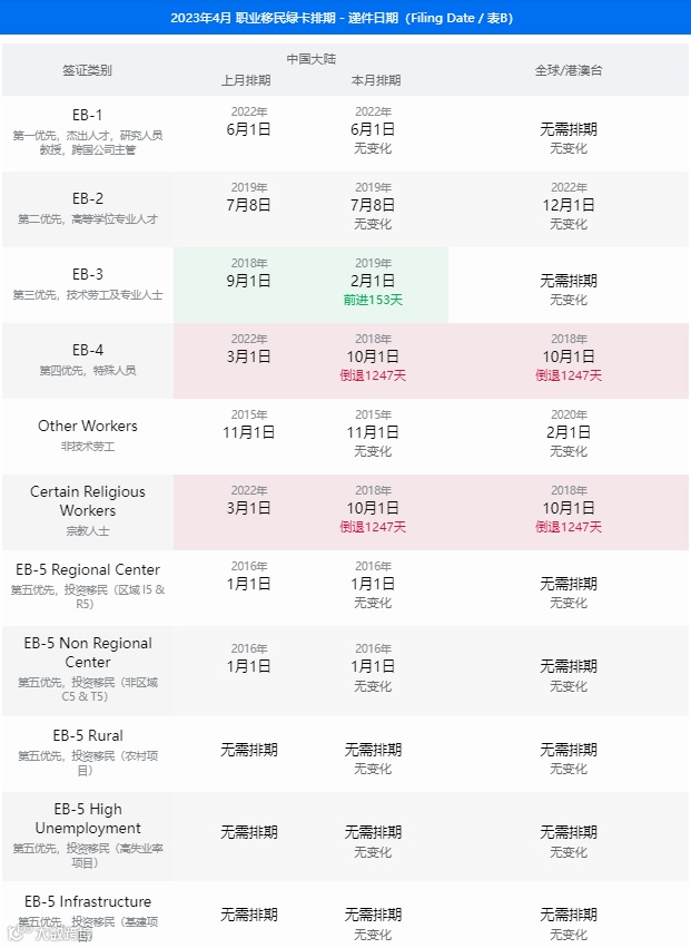 美国国务院签证办公室公布了2023年4月的签证公告(Visa Bulletin),关于职业移民和亲属移民排期表详情见以下表格。