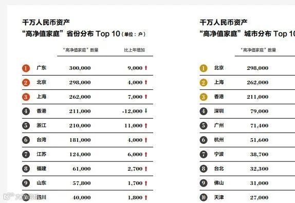 其中,中国拥有千万人民币家庭净资产较上年增加4万户,广东超越北京成为高净值家庭最多的地区,香港的高净值家庭规模同比下降。过去一年,高净值人群中的金领占比上升,企业主占比下降。