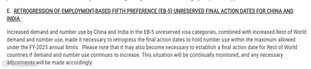 由于中国和印度对EB-5非预留签证类别的需求及签证使用量增加,叠加全球其他地区需求与签证使用量的同步上升,有必要将最终裁定日期倒退,以确保签证使用量控制在2025财年年度限额允许的最大范围内。需注意,若全球其他地区的需求和签证使用量持续增长,未来也可能需要为此类国家设立最终裁定日期。我们将持续监测这一情况,并据此作出必要调整。