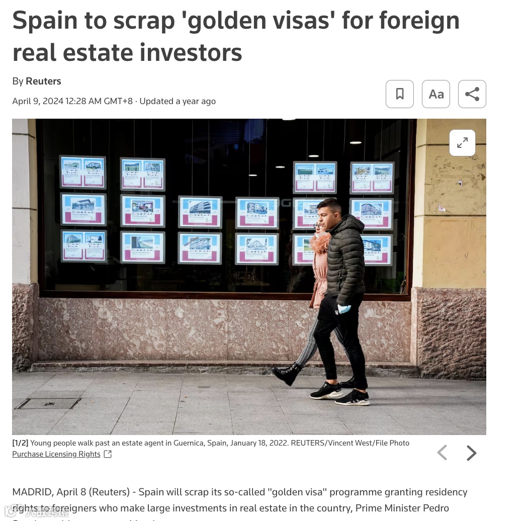 2024年12月19日,西班牙议会以177票赞成、170票反对的微弱优势,宣布通过了废除“黄金签证”的法案。