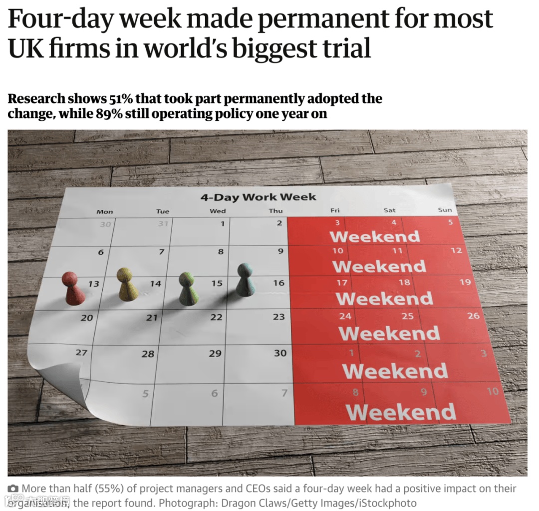其实,“上4休3”并非日本独创。冰岛在2015年至2019年间就进行过一项大型试验,结果显示,员工的幸福感和生产力都有所提高。英国、西班牙、新西兰等国也都在积极探索类似的工时制度。