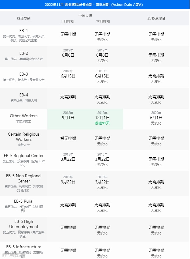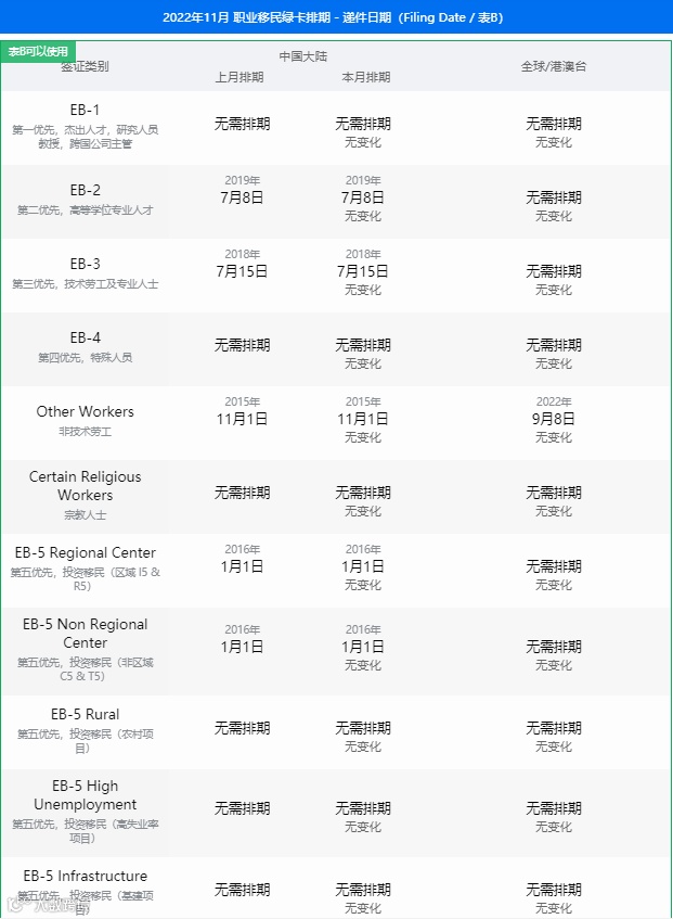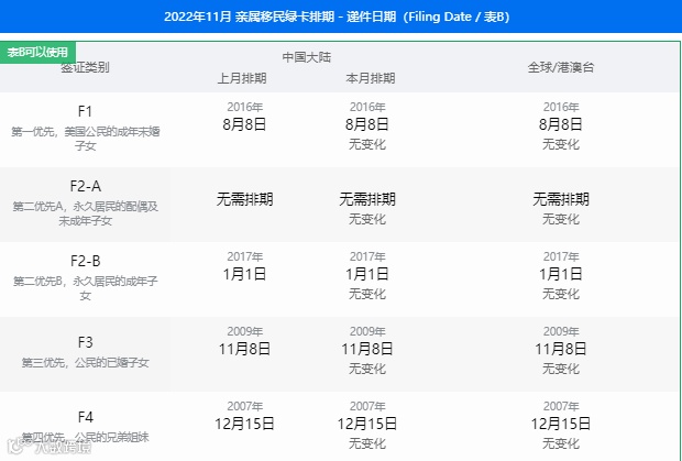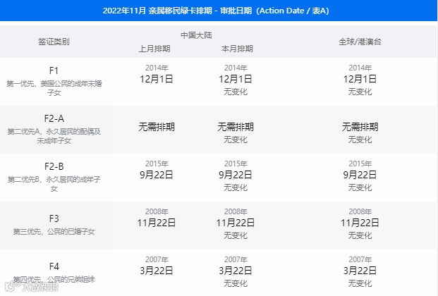 美国国务院签证办公室公布了2022年11月的签证公告(Visa Bulletin),关于职业移民和亲属移民排期表详情见以下表格。