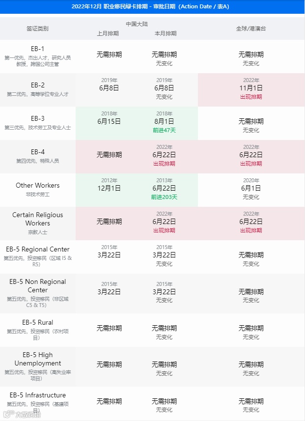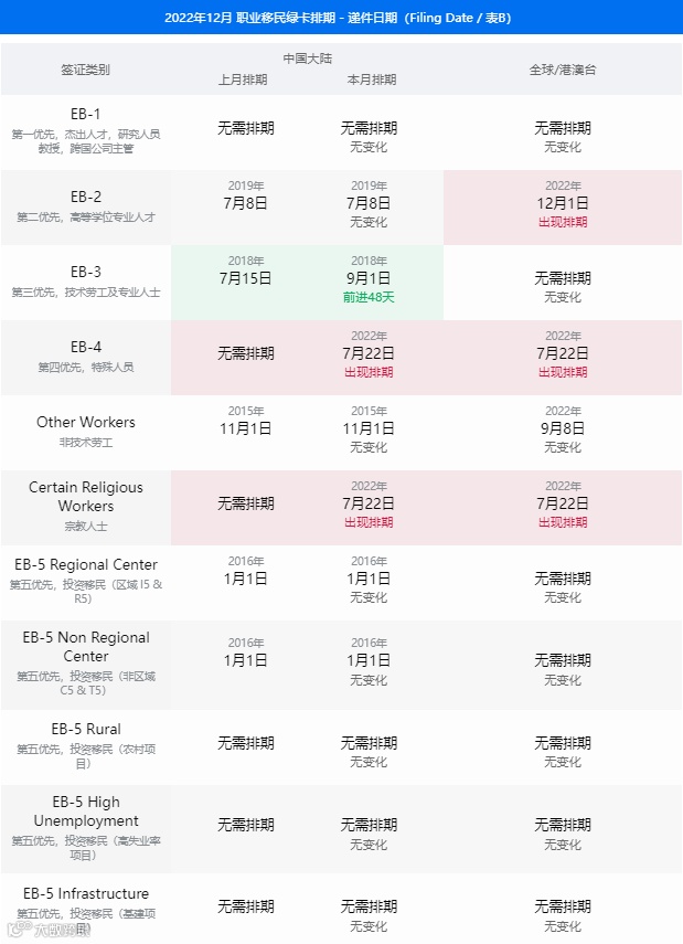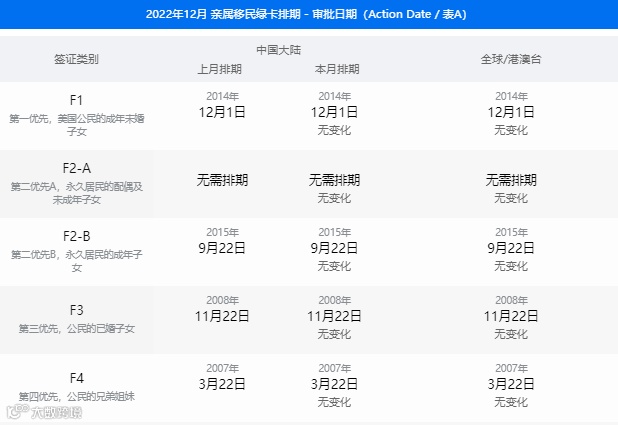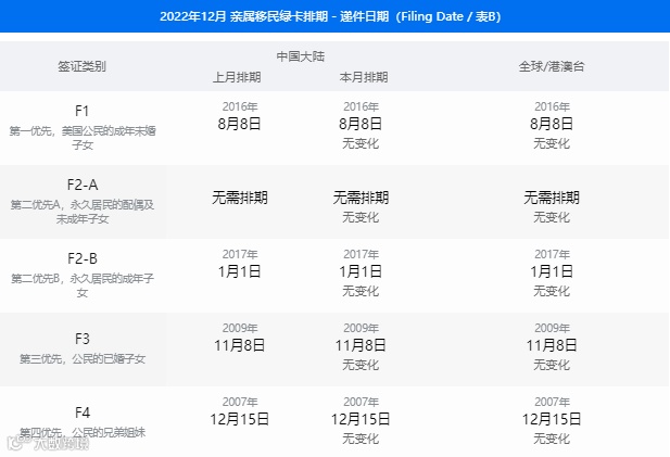 美国国务院签证办公室公布了2022年12月的签证公告(Visa Bulletin),关于职业移民和亲属移民排期表详情见以下表格。