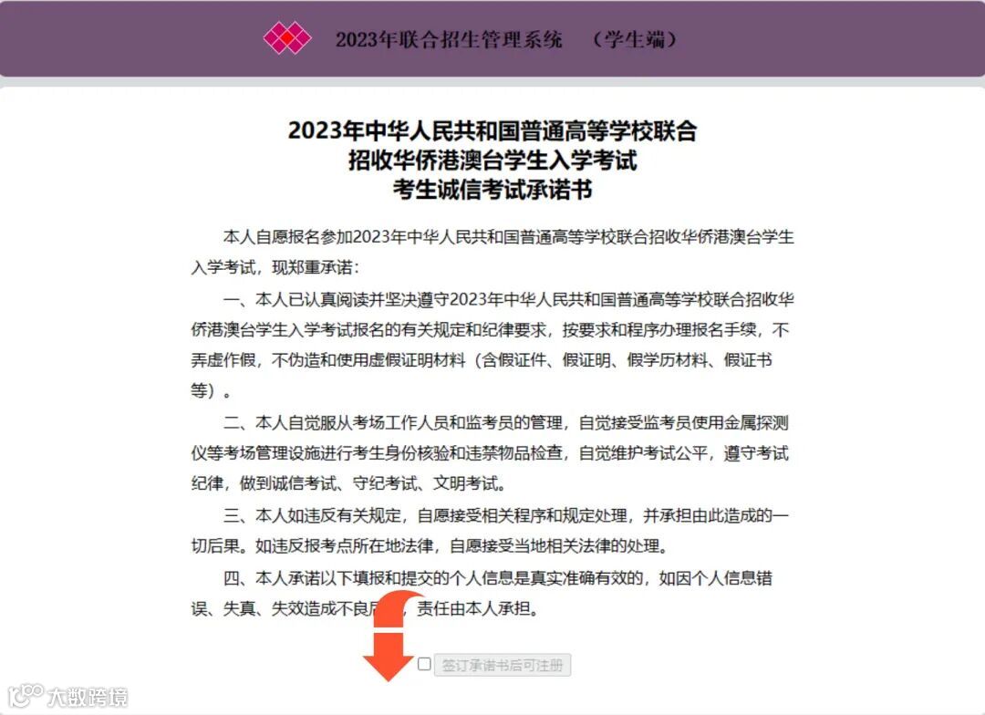 阅毕点击“已阅,进入下一步”,出现《考生诚信考试承诺书》,“签订承诺书后进入注册”处勾选,再点击进入注册页面。