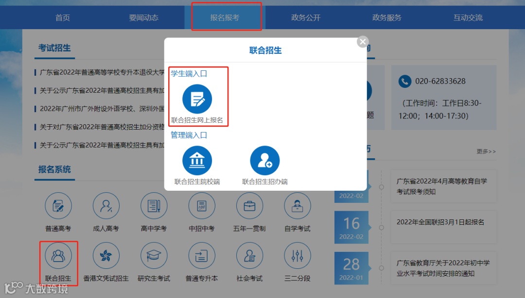 搜索“广东省教育考试院”官网,进入到广东省教育考试院——“报名报考“——“联合招生“——“学生端入口 联合招生网上报名“。