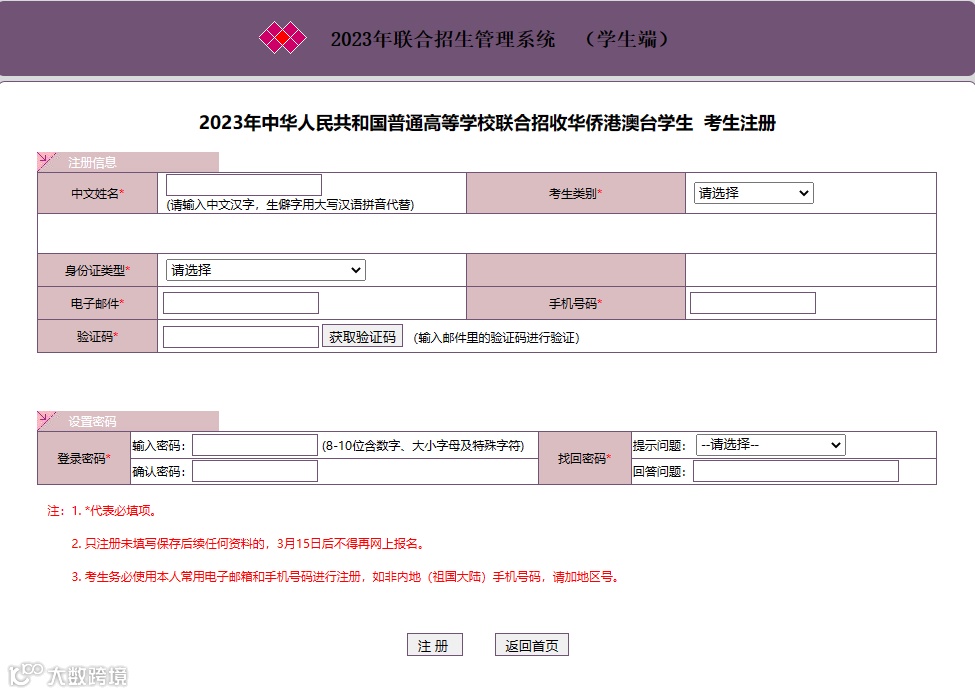2、考生务必使用本人常用电子邮箱和手机号码进行注册,如非内地(祖国大陆)手机号码,请加地区号。