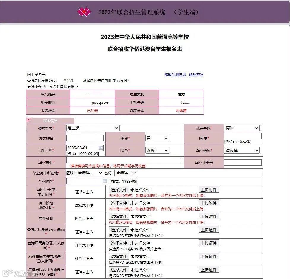 华侨生请注意:证件未齐全的华侨生先上传你现有的资料,先完成报名,等材料齐全了,再点击修改。华侨生在现场确认前,可以重新上传报名材料。