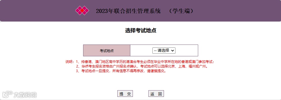 不要选择考试地点,不要点击提交,直接点击返回,请自己或者老师再检查一遍报名表,再选择考试地点,再提交。考试地点一旦选择,所有信息均不得修改。