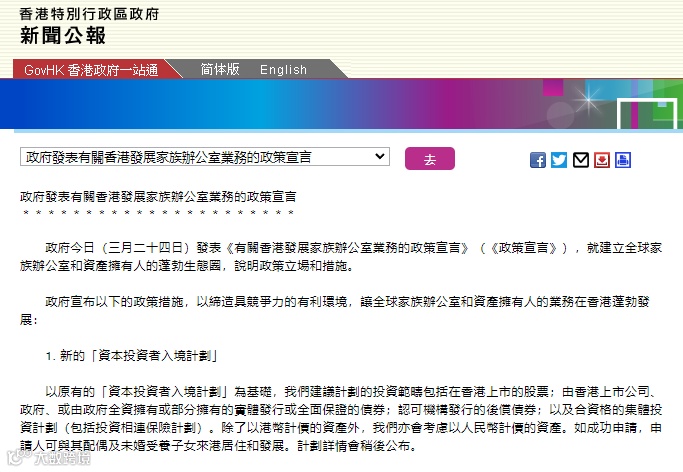 香港特区政府近日发表《有关香港发展家族办公室业务的政策宣言》,希望吸引全球家族办公室在香港开展业务。具体措施提到,如获立法会通过,由单一家族办公室在香港管理的家族投资控权工具(FIHVs)将获得利得税豁免。港府下一步将会检视现时有关基金和附带权益的优惠税制。另据香港税务局网站,享有利得税宽减的单一家族办公室的最低资产门槛为2.4亿港元。