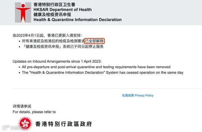 香港特别行政区政府卫生署消息:自4月1日起,无论是从内地或澳门抵港人士,还是从中国台湾或中国以外地区抵港人士,所有来港前及抵港后的检疫及检测要求已解除!