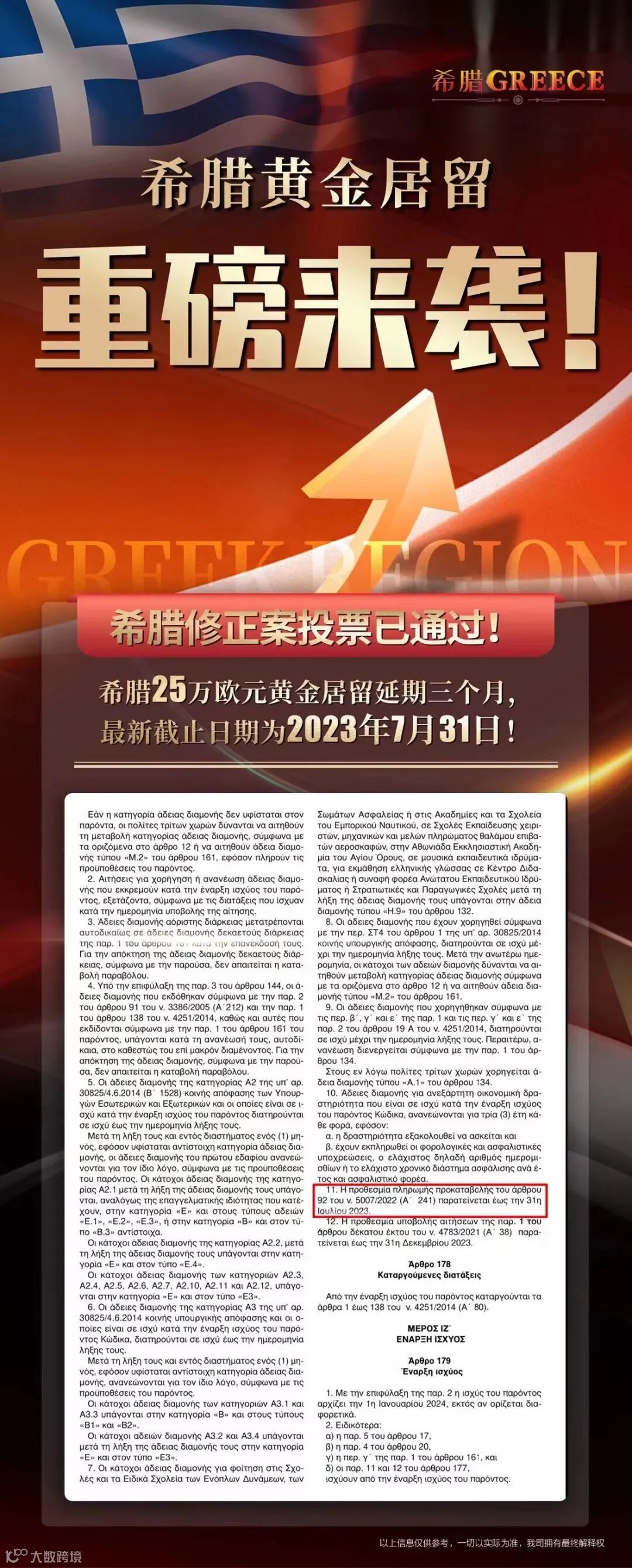 希腊当地时间3月29日传出最新消息:25万欧希腊黄金签证政策,延期至2023年7月31日!