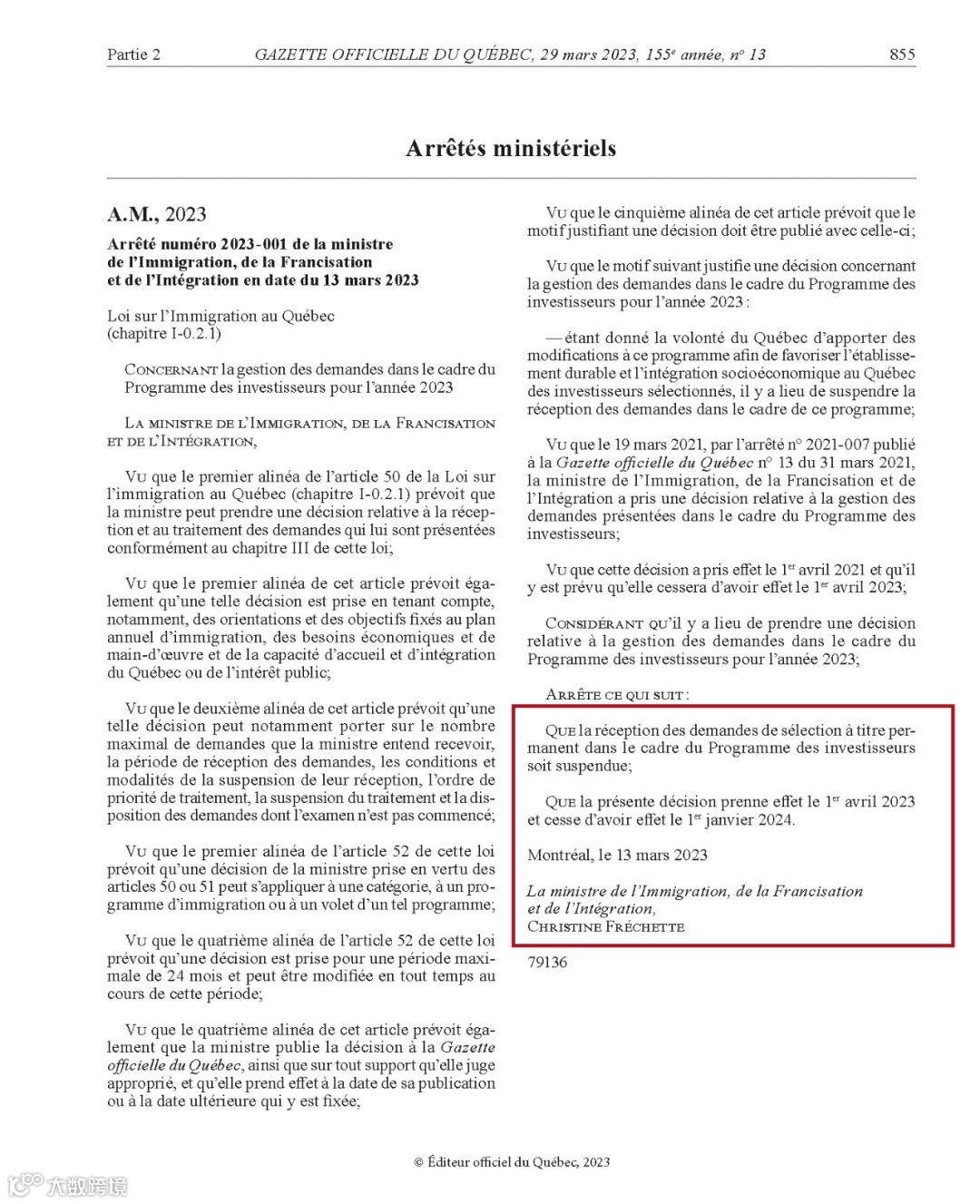当地时间3月29日,加拿大魁北克省发布公告:暂停接收投资者计划下的甄选申请;决定自2023年4月1日起生效,自2024年1月1日起停止生效。