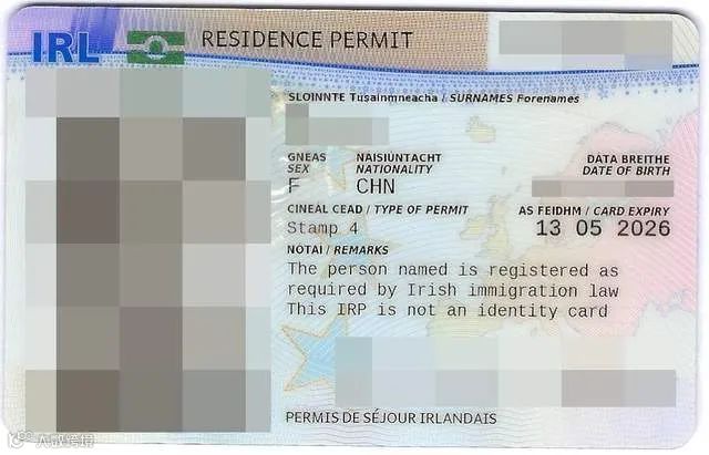 爱尔兰投资移民计划申请人,通常是先申请D类签证入境爱尔兰,然后换取Stamp4签证,即IRP卡,类似国内身份证,上面有具体的个人信息,签证类别和有效期。随同申请的16岁以下的子女无法办理IRP卡,需要监护人陪同办理re-entry visa。