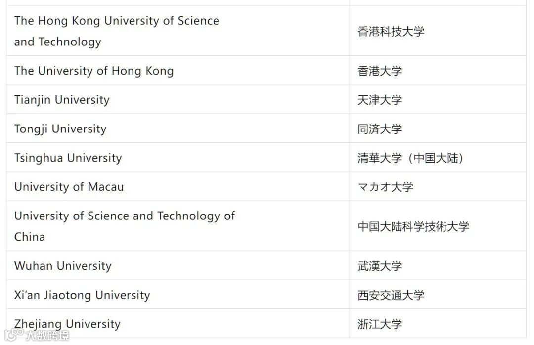 在最新一轮更新中,中国大陆获得认可的院校从原先的15所增至23所,新增了以下8所大学: