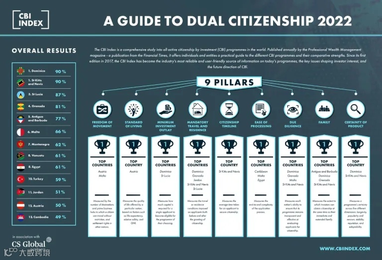 2022年8月22日,英国《金融时报》专业财富管理 (PWM) 杂志发布了第六版《全球公民指南:CBI 指数》。圣基茨CBI以优异的评分,位居榜首。